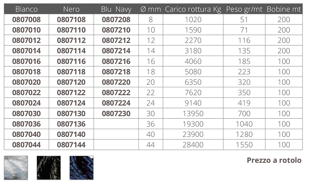 Amarre à 3 brins coulants. En fibre polyester haute ténacité. Traitement Gherlino, résistant aux rayons UV, excellente résistance à la rupture, très faible allongement. Idéal pour l'ancrage nautique et le mouillage lourd, pour les charges lourdes et les usages techniques.