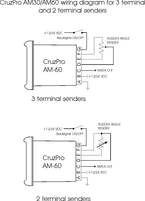 L'AM-30 affiche l'angle de barre avec une lecture comprise entre -90 et +90 degrés et est capable de fonctionner avec les capteurs les plus courants. Il est possible de calibrer le capteur installé à bord et de mettre le zéro (gouvernail centré).