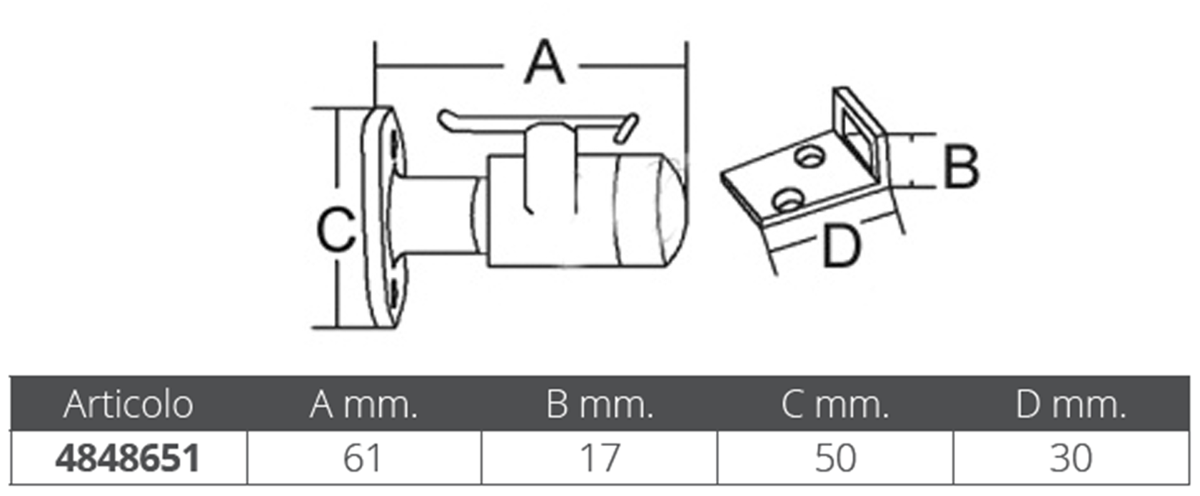 Butée de porte en acier inoxydable AISI 316, longueur. mm. 61, diamètre de base mm. 50