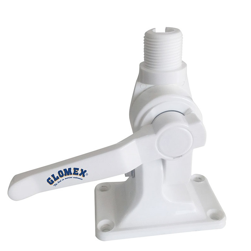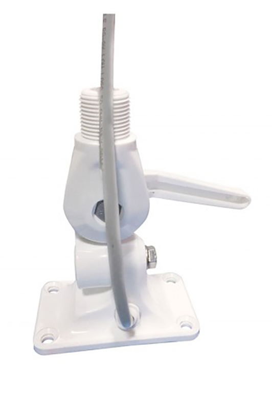 Base à double articulation en nylon renforcé résistant aux rayons UV, avec verrouillage par levier et passage de câbles et passe-câbles pour accès sous le pont incorporés dans la base. Filetage standard 1"x14.