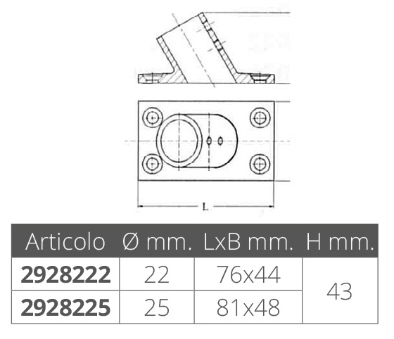 Raccords en acier inoxydable AISI 316 poli miroir avec base rectangulaire droite. Dim.art. 29,28222 base mm. 76x44x43h, art. 29.28225 base mm. 81x48x43h