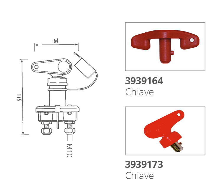 Coupe-batterie unipolaire, avec clé amovible. Service continu de 140 A, 2000 A / 3 ". Conforme à la norme UNI EN 28846. Exécution en matière plastique, contacts en cuivre argenté. Fixation sur bride Ø mm. 64