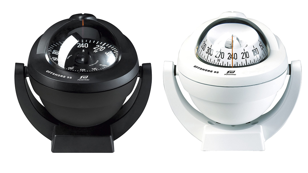 Compas offshore 95 Ø apparent mm. 81. Rose avec graduation tous les 5°, pour bateaux à moteur de 6 à 10 mètres, éclairage LED standard 12-24 V. Installation du support sur une surface horizontale ou verticale