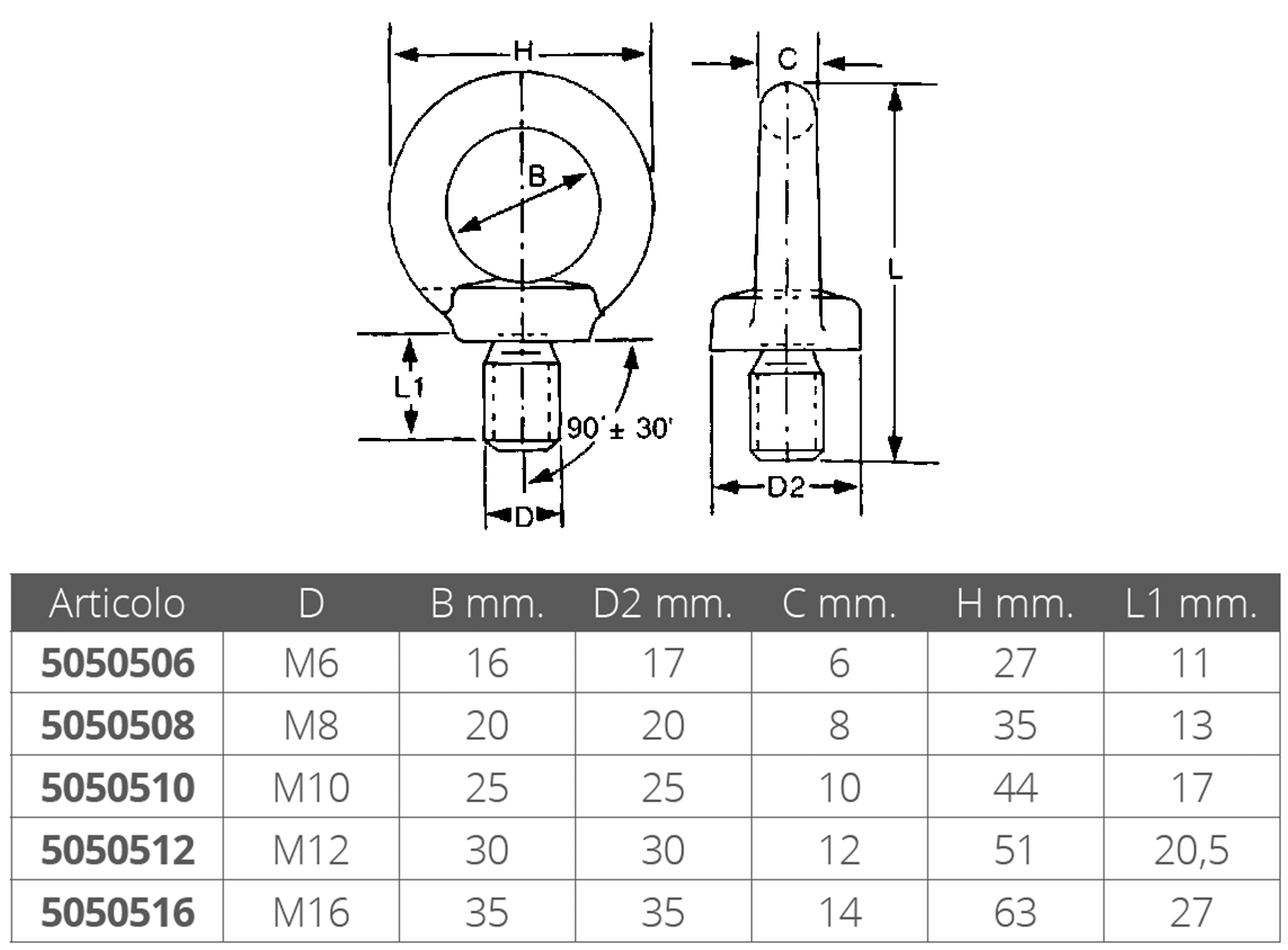 Oeillet à œil circulaire en acier inoxydable AISI 316 avec tige filetée. Dimensions: D M6 B 16 mm. D2 17mm. C 6 mm. H 27 mm. L1 11mm.