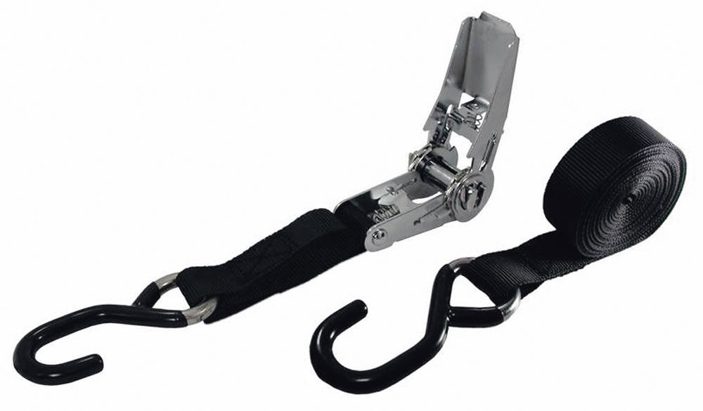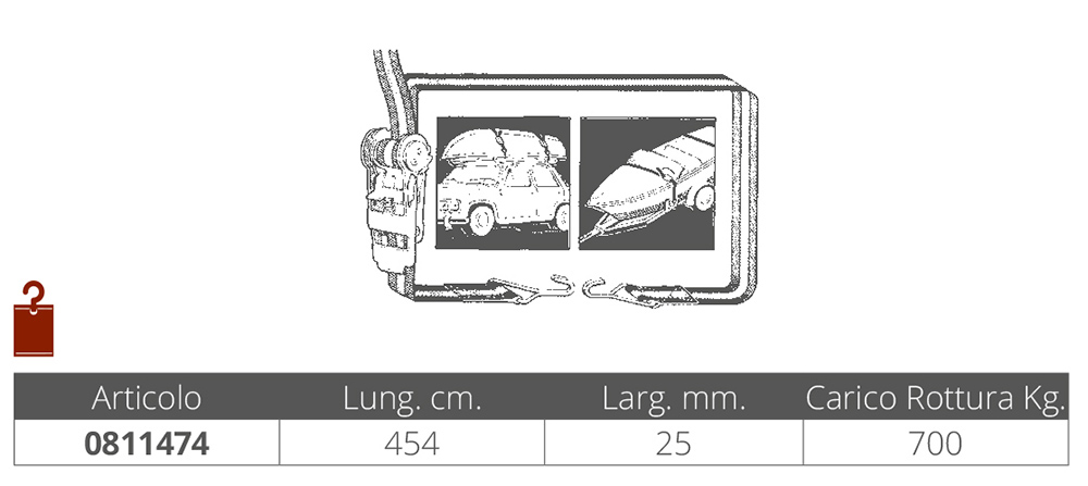 Largeur de sangle en nylon mm. 25, longueur cm. 454, avec boucle de tension à cliquet en acier inoxydable, crochet en acier recouvert de vinyle. Charge de rupture kg. 700