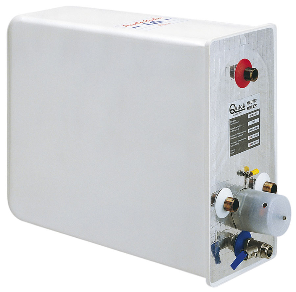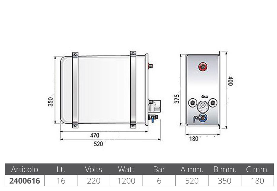 en matériau thermoformé et réservoir en acier inoxydable AISI 316. Raccords de sortie 1/2 ". Alimentation 220V, consommation 1200 watts, pression max 6 bar, dimensions mm. 520x350x180