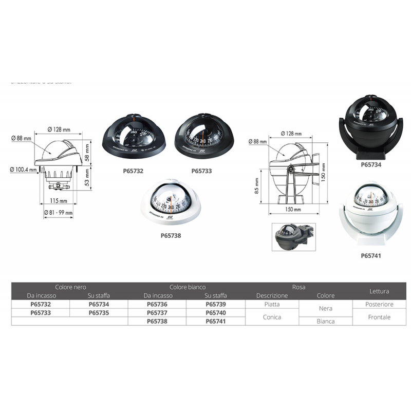 Compas Offshore 95 conforme ISO 613 pour bateaux à moteur de 6 à 10 mètres, rose plate noire avec gradation 5°. Montage encastré sur une surface horizontale. Dimensions mm. 128x111