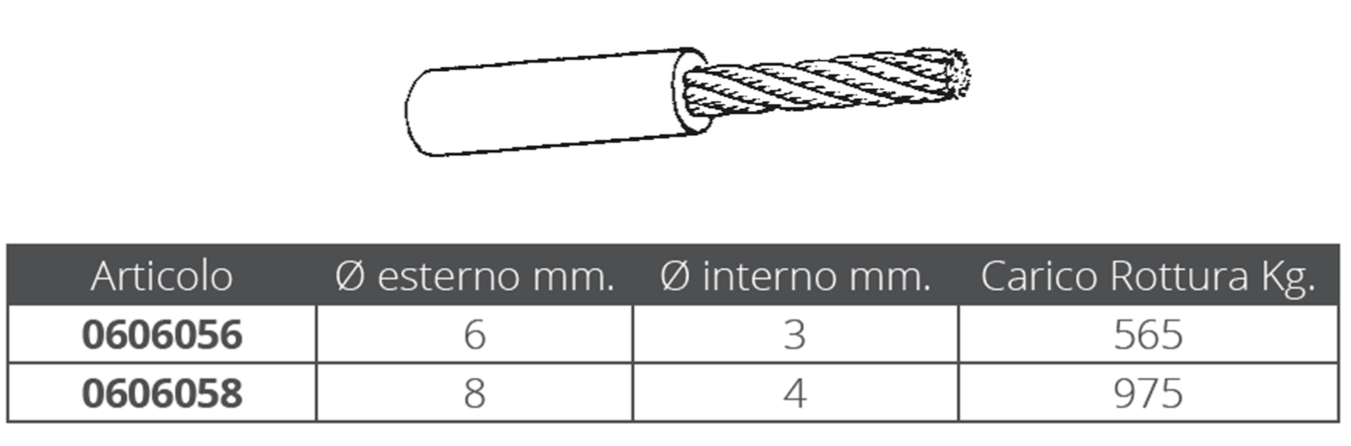 Corde en acier inoxydable enduit Corde en acier inoxydable AISI 316 49 fils, recouverte de matière plastique blanche pour garde-corps et mains courantes, en bobines de 100 mètres. Dimensions : Ø extérieur 6mm. Ø intérieur 3mm. Charge de rupture 565 kg.