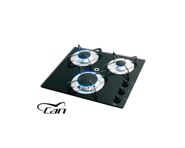 Cuisinière 3 feux intégrée avec plateau en verre trempé et dispositifs de sécurité thermique.