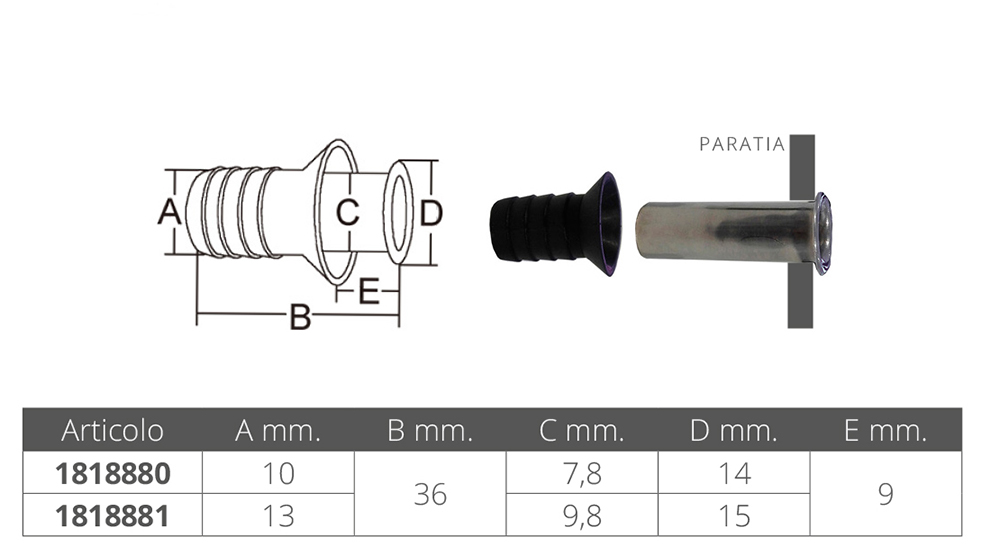 Drain de petite taille en caoutchouc et acier inoxydable AISI 316, particulièrement adapté pour les pics d'ancrage et les tasseaux.