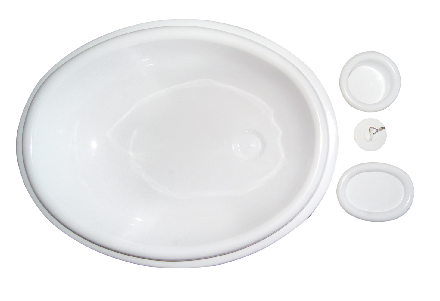 ÉVIER EN NYLON Lavabo ovale en PVC blanc pour salle de bain avec bonde et bonde (art.2424030). Dimension intérieure mm. 400x360. Prof. mm. 80, mm extérieur. 465x365, coupé mm. 300x400.