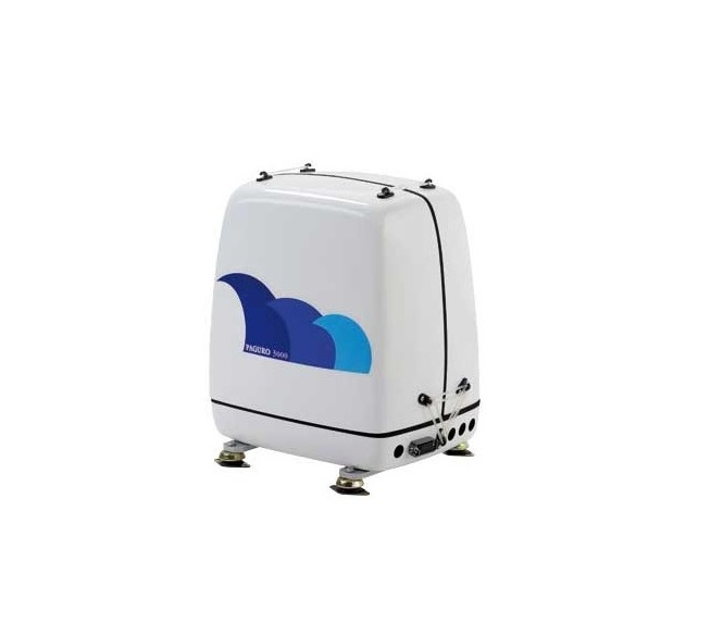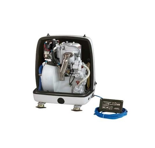 Générateur Paguro avec moteur Yanmar Diesel et boîtier en fibre de verre insonorisé. Complet avec panneau de commande à distance avec câble de 15 m, compteur horaire, arrêt automatique en cas d'anomalies, kit de support anti-vibration pour la fixation, seringue de vidange d'huile, roue de secours de la pompe à eau, préfiltre à carburant et poignée de démarrage d'urgence.