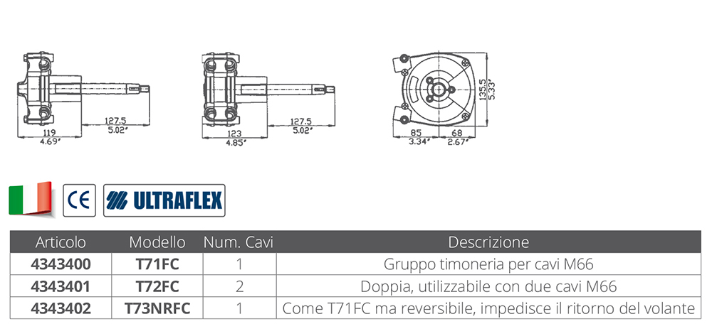 Il utilise un câble unique M66 comme le t71fc mais réversible, il empêche le retour du volant. Extrémité du câble en acier inoxydable. Configuration conforme ABYC. Fait de matériaux résistants à la corrosion marine. Particulièrement adapté au cas où l'espace derrière le tableau de bord est limité. Possibilité d'installation à 90° ou 20° avec ou sans embrayage. Nombre de tours du volant : 4. Course d'actionnement : 228 mm. Diamètre maximum admissible du volant mm. 406. Rayon de courbure minimum du câble : 200 mm. Certifié par NORSKE VERITAS. Conforme à ABYC P17. Utilisation : bateaux à moteurs hors-bord, in-bord, in-outboard. Enjoliveur non inclus