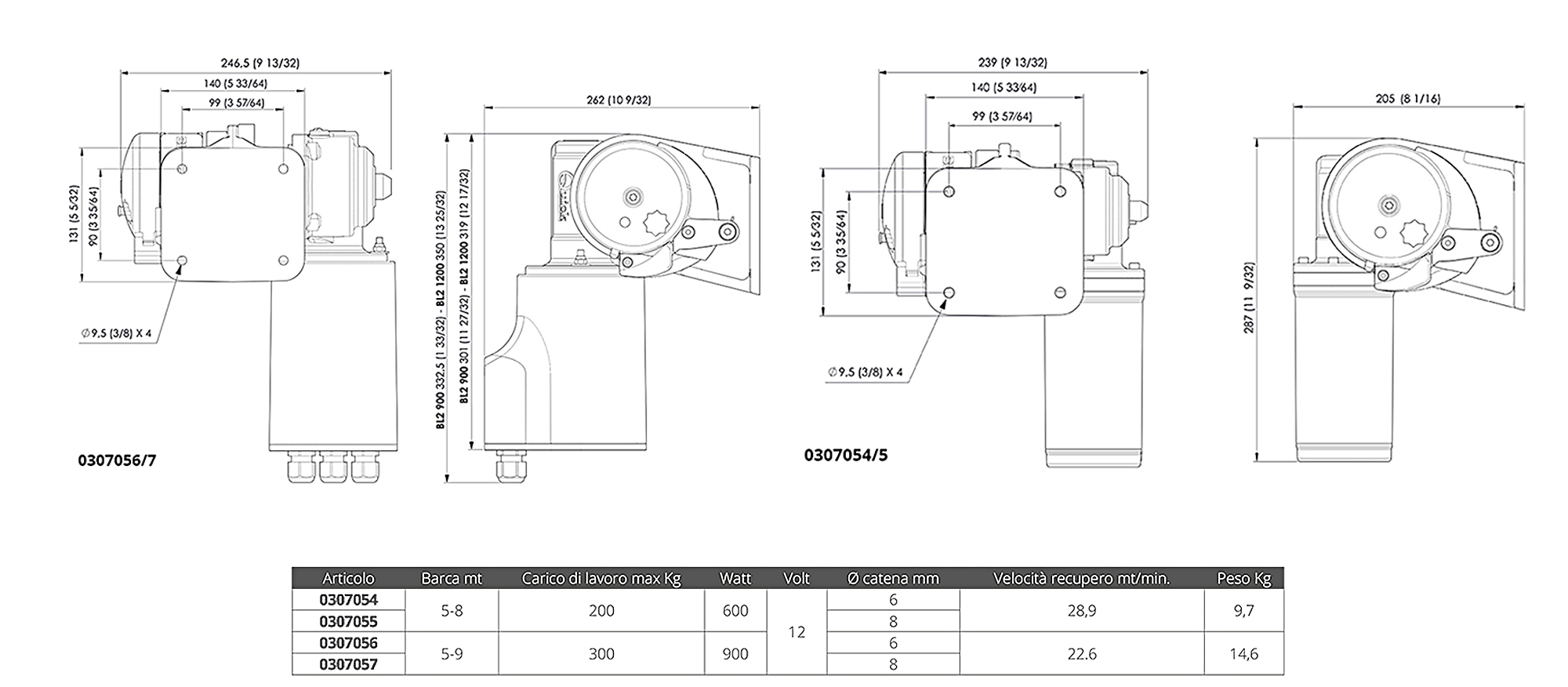 Guindeaux horizontaux avec base en acier inoxydable AISI 316 et bronze chromé, corde et chaîne sur un seul barbotin.