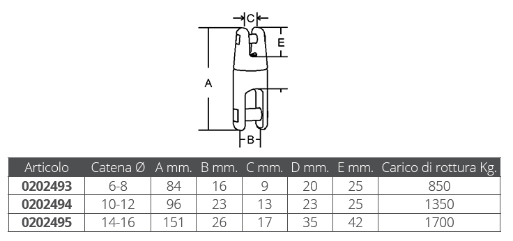 Charge de rupture Kg. 850, pour chaîne Ø mm. 6-8, dimensions mm. A.84 B.16 C.9 D.20 E.25