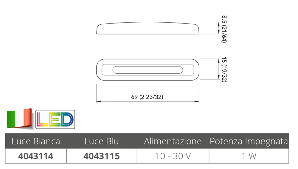Lampe de courtoisie étanche IP 65 à 4 LED, en plastique avec finition brillante, équipée d'un diffuseur qui projette la lumière vers l'avant. Lumière naturelle blanche ou bleue. Fixation par vis. Sensible à la polarité.
