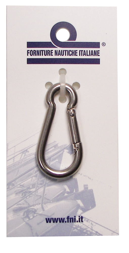 Mousqueton en acier inoxydable AISI 316, emballé sur une carte pré-perforée pour faciliter l'exposition.