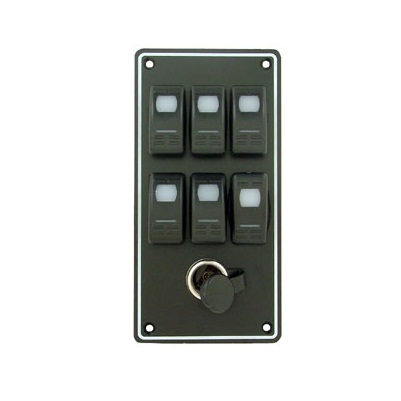 Tableau électrique Black Sea 6S avec prise étanche 12V Pré-câblé avec 6 interrupteurs Contour 16A étanches, 6 fusibles, 6 lumières LED et une prise étanche. Cadre en polyuréthane anodisé.