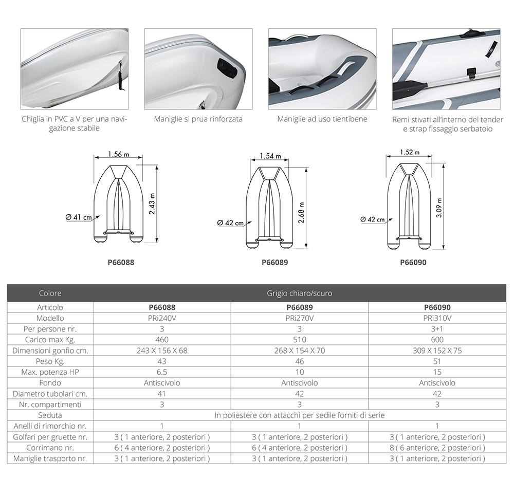 Annexe à coque rigide en forme de V pour des mouvements rapides en toute sécurité, adaptée pour nr. trois adultes, charge maximale de 510 kg., diamètre tubulaire 42 cm, trois compartiments avec siège en polyester, équipé d'un sac de transport, d'un kit de réparation, d'un gonfleur et de deux pagaies.Puissance maximale du moteur 10 CV. Dim.cm. 268 x 154 x 70, poids 46 kg