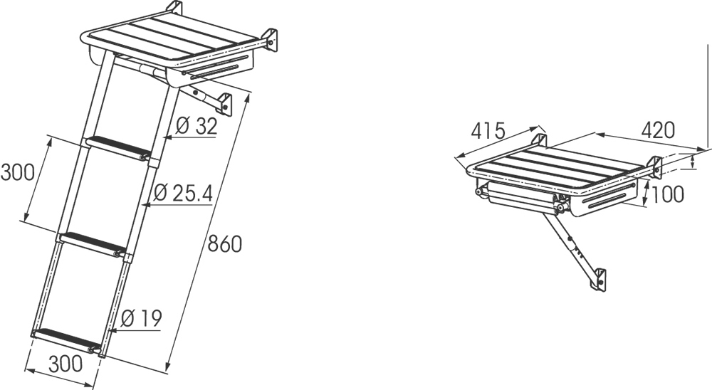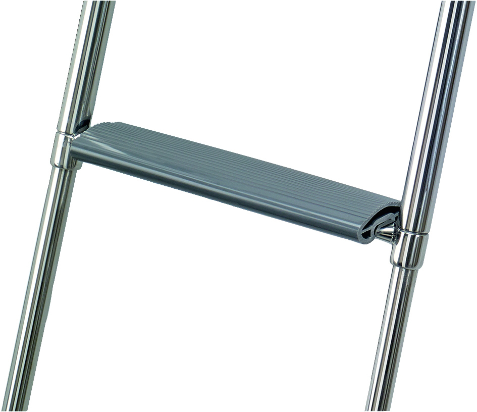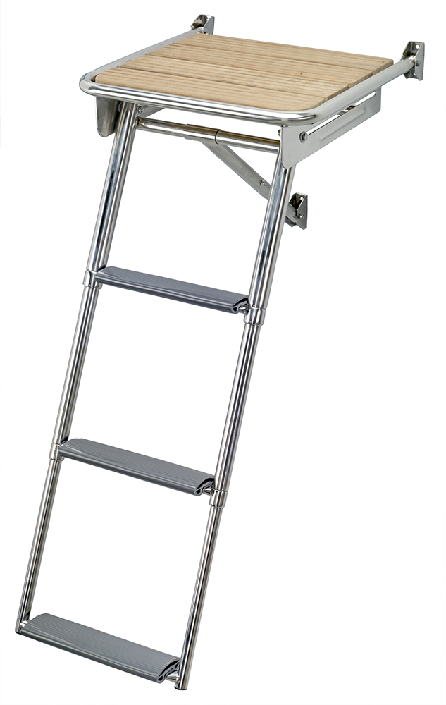 Plate-forme arrière en teck avec échelle télescopique escamotable en acier inoxydable, marches en PVC gris antidérapant, largeur mm. 70 pour plus de stabilité et de confort.