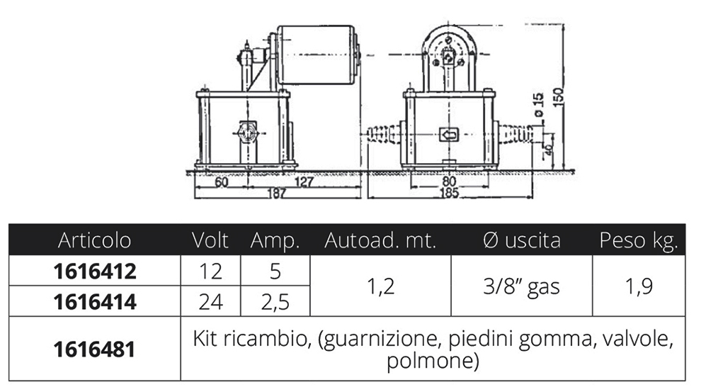 Débit 10 lt / min auto-amorçant 1,2 mt. Ø sortie 3/8" gaz poids 1,9 kg, dim.mm. longueur 187 mm x largeur 185 x 150 mm