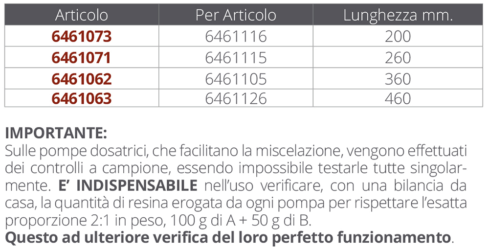 Pompes et mini-pompes pour le dosage de C-SYSTEM 10 10 CFS. Attention : dans tous les types de conditionnement, pour maintenir le bon rapport de mélange 2 : 1 en poids, il faut effectuer 1 pompage du composant A et 1 pompage du composant B. IMPORTANT : Sur les pompes doseuses, qui facilitent le mélange, des contrôles aléatoires, comme il est impossible de les tester tous individuellement. Il est INDISPENSABLE à l'usage de vérifier, avec une balance domestique, la quantité de résine distribuée par chaque pompe pour respecter la proportion exacte 2 : 1 en poids, 100 g de A + 50 g de B. C'est une vérification supplémentaire de leur parfait fonctionnement.
