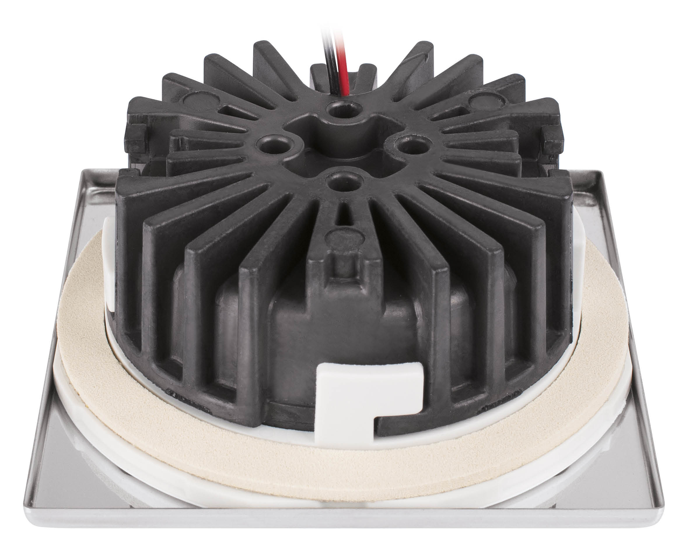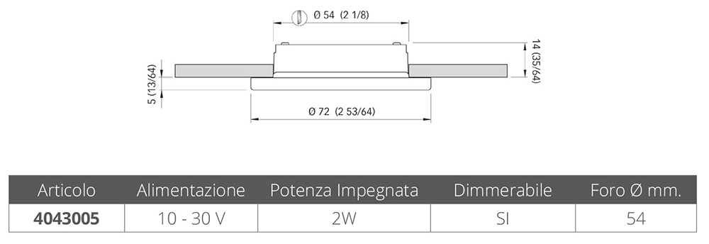 Spot étanche IP66 à 2 LED (105 Lumen), haute luminosité, lumière blanc chaud avec cadre circulaire en plastique finition blanc RAL 9010, gradable, sensible à la polarité. Alimentation 10-30v, Ø extérieur mm. 72, trou Ø mm. 54, profondeur 14 mm