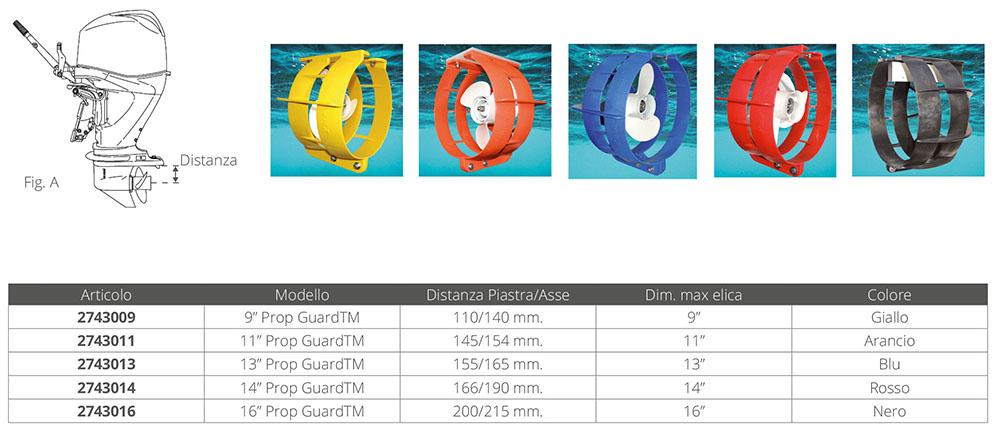 Protection d'hélice pour moteurs hors-bord en polypropylène à haute résistance et visibilité, elle peut être installée facilement et en quelques minutes. C'est la seule protection qui offre la sécurité pour les personnes environnantes et pour l'hélice elle-même, augmentant ses performances et réduisant la consommation. Pour choisir le modèle Prop GuardTM pour votre bateau, mesurez la distance entre la plaque anti-cavitation et le centre de l'arbre d'hélice (voir Fig. A).