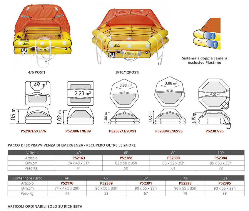 Conçu pour la navigation dans des conditions extrêmes, certifié ISO9650-1 et catalogué en classe A (activation à -15°C), il est construit avec double plancher isolé avec arche à ouverture automatique et éclairage extérieur 4.3 cd. Il est équipé de grandes poches de confinement pour les équipements de sécurité et de survie, d'une grande ancre flottante et d'une échelle lestée réversible qui permet une remontée facile et confortable depuis la mer. Deux types d'équipements de survie sont disponibles en fonction du temps que la victime peut passer dans le radeau à attendre les secours : le standard, sans eau potable ni nourriture, si les secours sont attendus dans les 24 heures suivant le séjour en mer, qui d'urgence, qui comprend également de l'eau et de la nourriture, si des forces de secours sont attendues au-delà de 24 heures en mer.