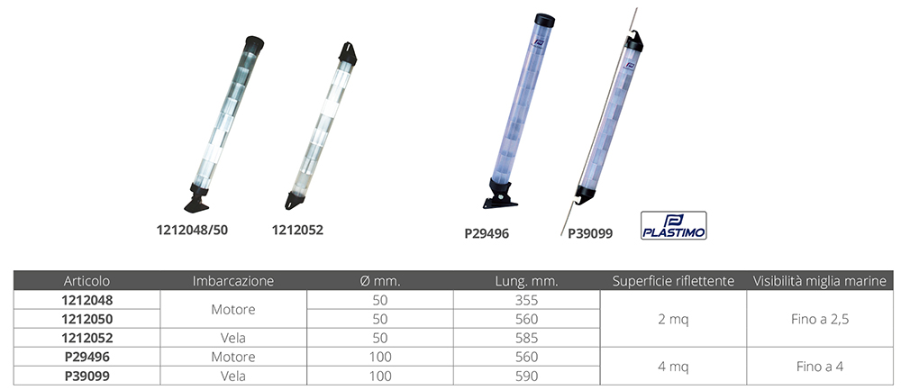 Réflecteur radar colonne Ø mm. 50, longueur mm. 585 avec rainure de fixation sur haubans pour voiliers. Surface réfléchissante m². 2