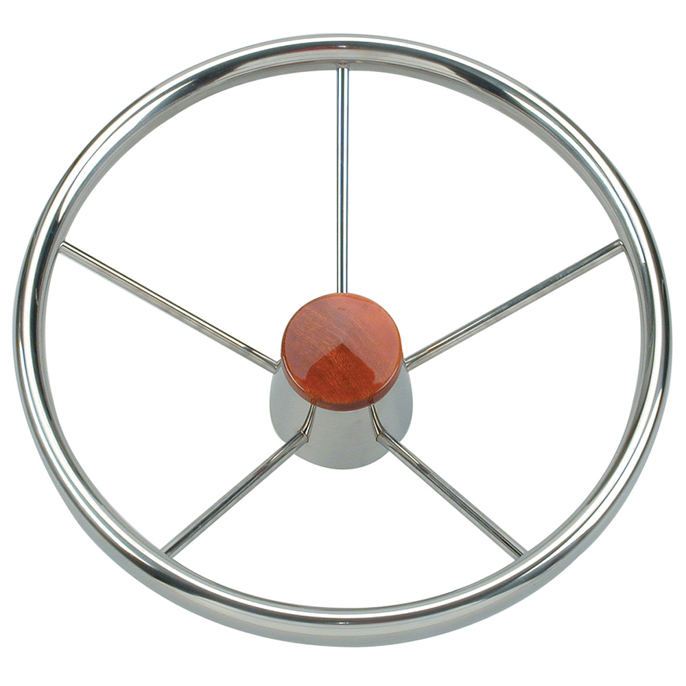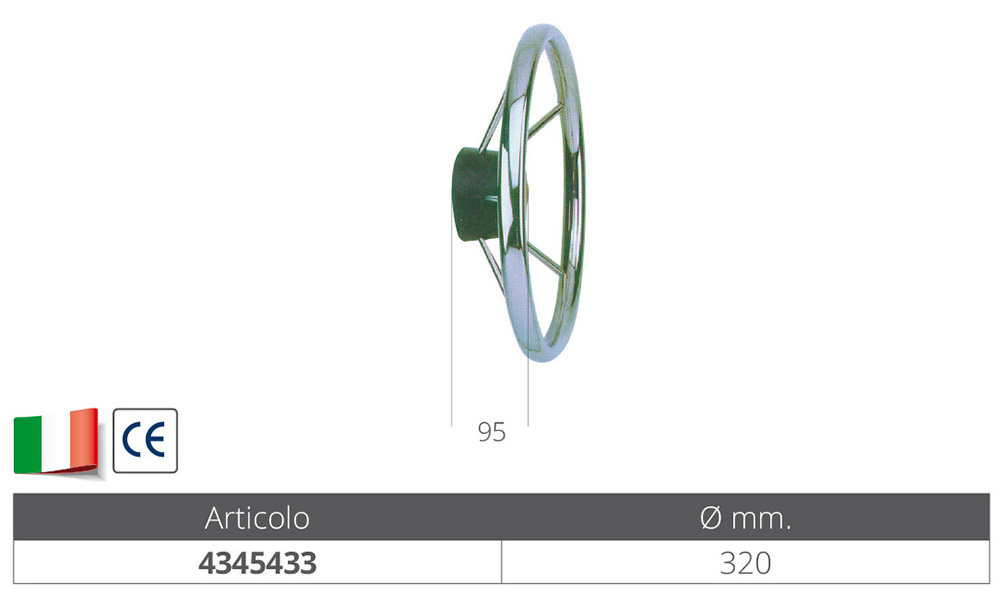 Volant à 5 branches en acier inoxydable. Moyeu en aluminium recouvert de polyuréthane noir. Manche à section ovale, Ø mm. 320, saillie 95 mm, cône universel