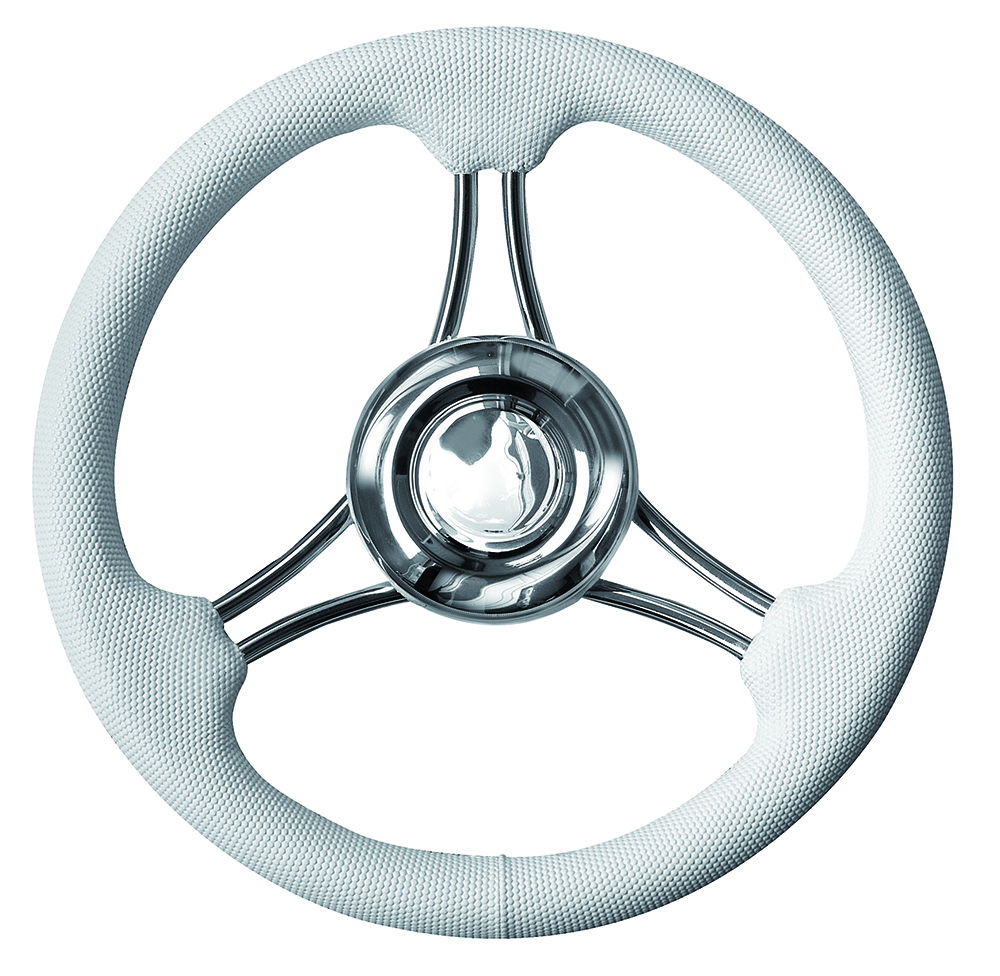 Volant à trois branches avec poignée et rayons en acier inoxydable recouvert de polyuréthane souple, cône universel