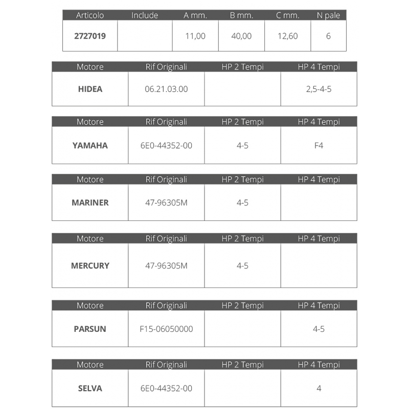Réf or YAMAHA / SELVA 6E0-44352-00, pour moteurs 2T 4-5 CV et 4T 4 CV réf or MARINER 47-96305M, pour moteurs 2T 4 CV dim. Ø int 11 mm Ø ext 40 mm épaisseur 12,6 mm, nr 6 lames