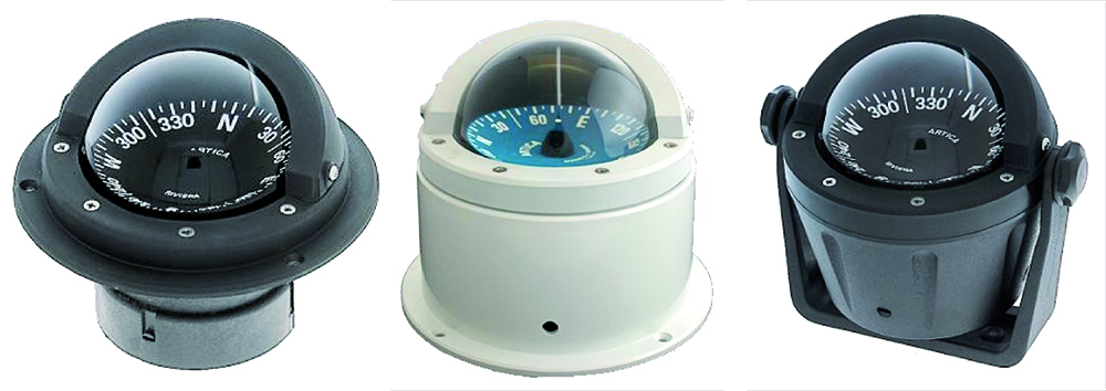Boussole Série Arctique Apparent Ø 2'3 / 4 (70 mm.). Suspension interne semi-cardan. Compensation intégrée. Eclairage de série 12 V. Ecran anti-éblouissant, rose avec graduation blanche de 5°.