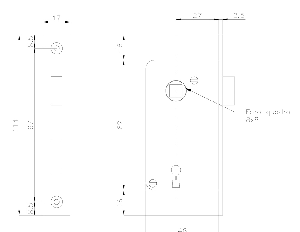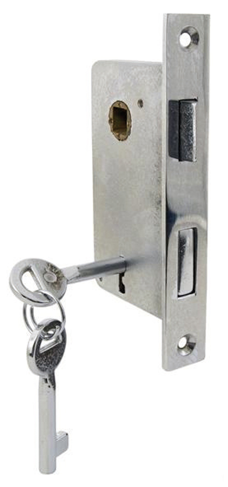 Serrure à encastrer en laiton chromé avec clé. mm intégré. 83 x 46 mm carré. 8