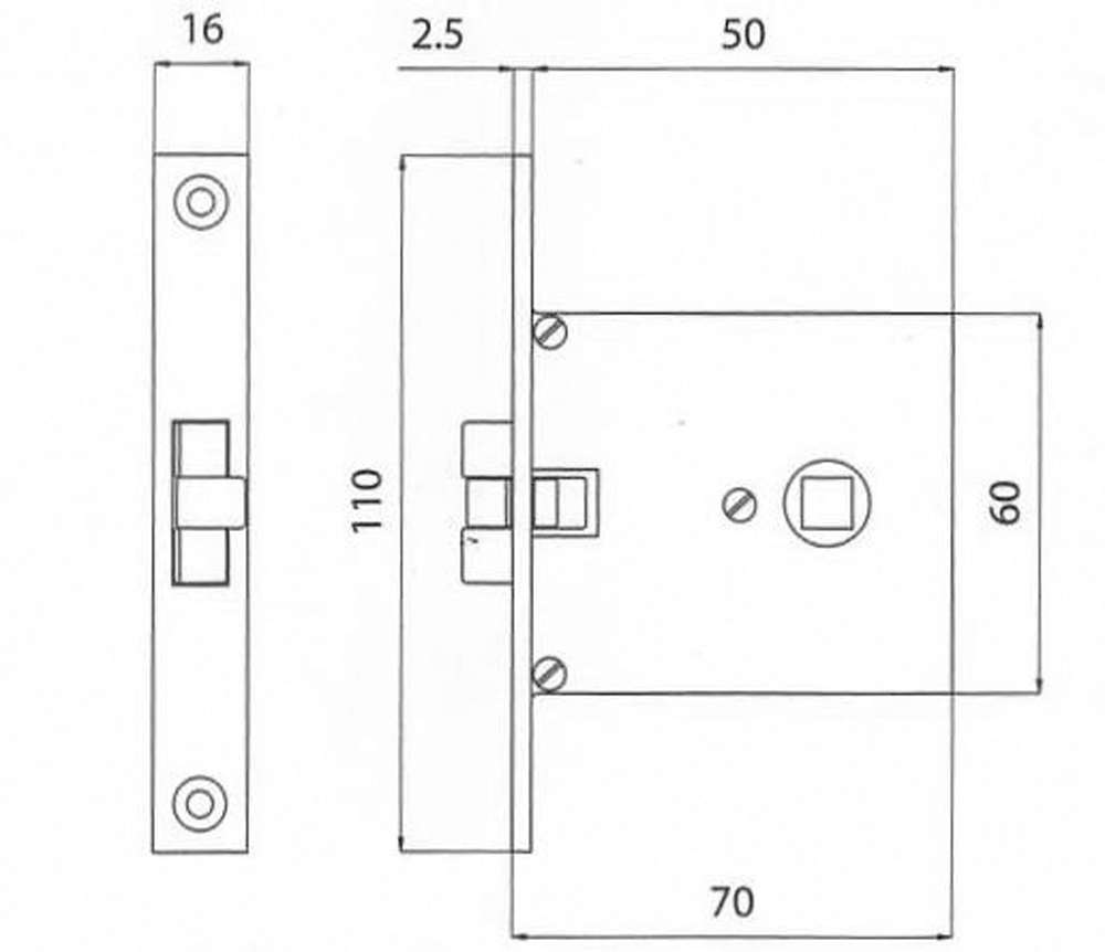 Serrure à encastrer en laiton chromé avec loquet anti-vibration. 70 x 60 x 10. Affichage mm. 110x16x2mm. 8
