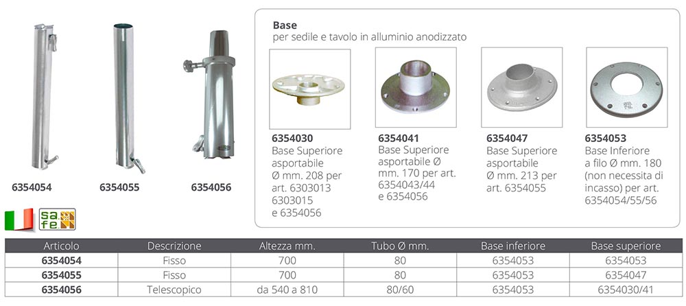 Support de table en aluminium anodisé poli, rotatif à 360 °, totalement amovible avec bloc d'expansion mécanique dans la base inférieure.