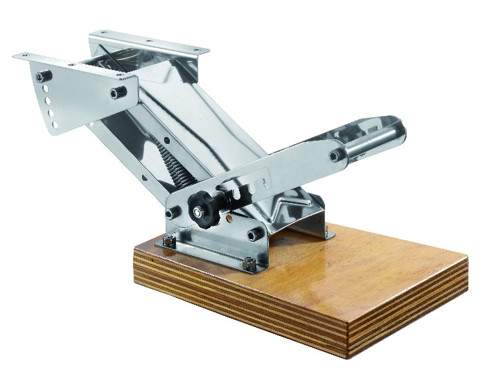 Support moteur hors-bord auxiliaire en acier inoxydable et contreplaqué marine, avec rappel par ressort, course réglable en 4 positions avec verrouillage anti-déblocage. Excursion verticale cm. 27.