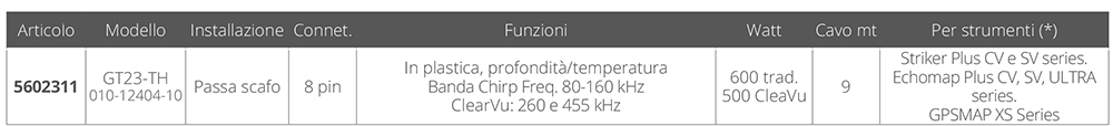 Transducteur de passage de coque en plastique avec température / profondeur, fréquence de bande Chirp 80-160kHz, Clear VU 260 et 450kHz, puissance de transmission sur Clearvu 500w et 600W sur sonar. Traducteur compatible avec les séries Stricker Plus Cv et SV, Echomap Plus, CV, SV, ULTRA SERIES, GPSMAP XS. Livré avec câble de 9 m.