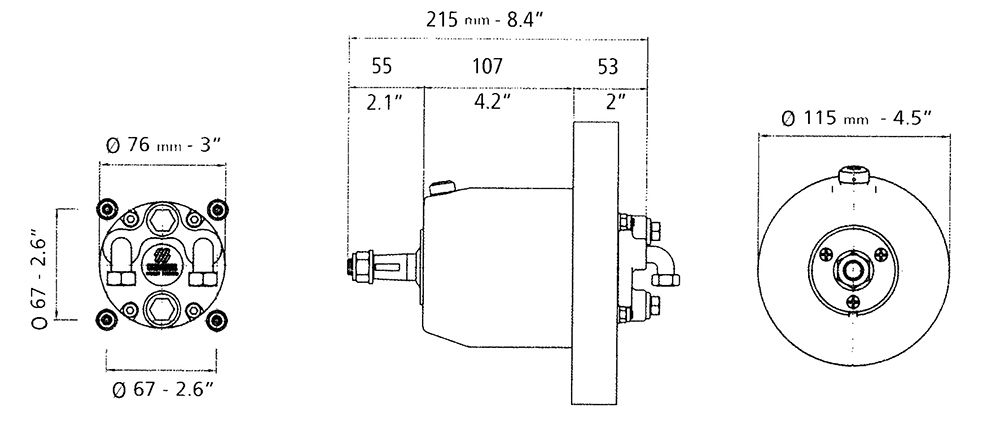 Pompe à montage avant, structure compacte, système à pistons axiaux, clapet anti-retour qui empêche la réversibilité, soupape de protection contre les surpressions, arbre conique 3/4 en acier inoxydable, rotor en fonte pour une plus longue durée de vie, remplissage d'huile avant, conçu pour les raccords 1/4 NPT, pour tuyau 3/8 complet avec raccords coudés. Possibilité de montage semi-encastré.