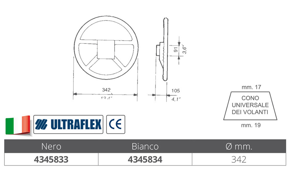 Volant à 4 branches en matériau thermoplastique antichoc, adapté à tous les bateaux. Ø mm. 342, saillie mm. 105, cône universel